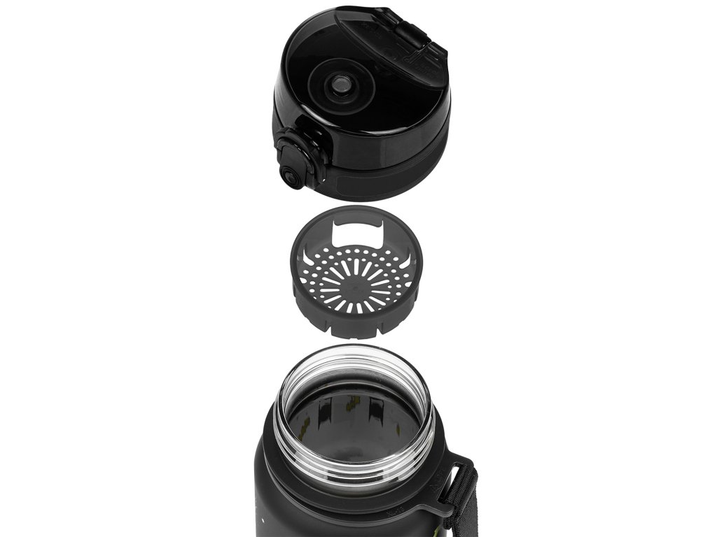 Uzamykatelné víčko nepropustí ani kapku nápoje a zaručuje jednoduché a intuitivní používání. Součástí láhve je i sítko, díky kterému můžete láhev použít i na limonády s ovocem nebo čaj (materiál je vhodný i pro horké nápoje). K láhvi je připevněné také poutko pro pohodlné nošení v ruce.