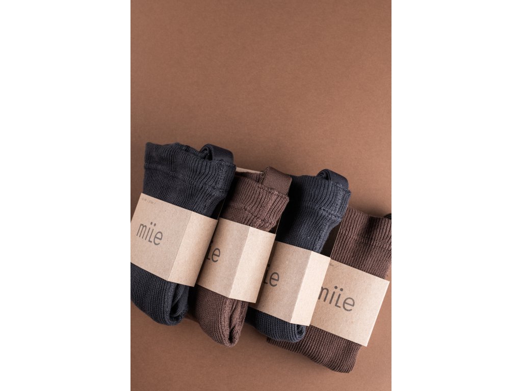 Vyrobeny z nejjemnější česané bavlny (85 %) původem z EU a barveno certifikovanými švýcarskými barvami. Doplněno jemným polyamidem (15 %) díky, kterému drží tvar a jsou odolnější. Polyamid je vpleten mezi bavlnky tak, aby se nedotýkal dětské pokožky, proto jsou vhodné i pro ekzematickou pokožku. V pase na gumičku, kterou můžete regulovat.